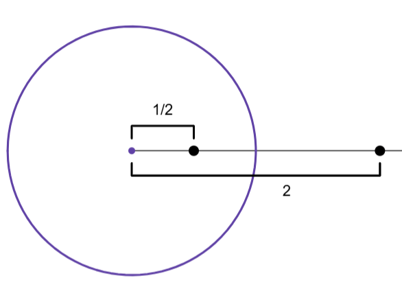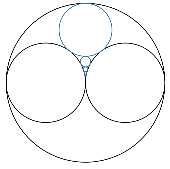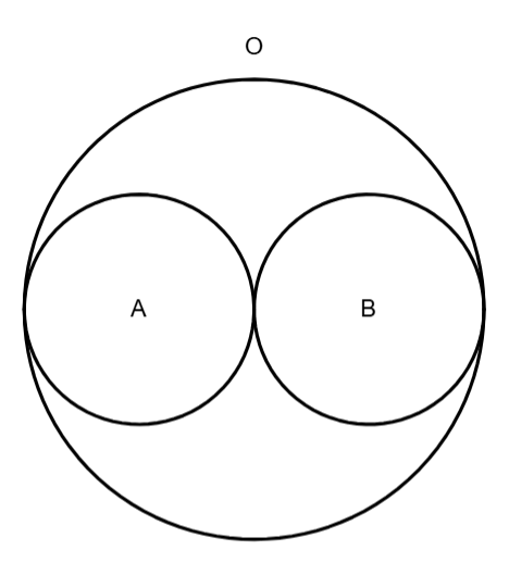 You have a circle of radius 1. Call it O. Two other circles of radius 1/2, A and B, are internally tangent to O and externally tangent to each other, like so:
