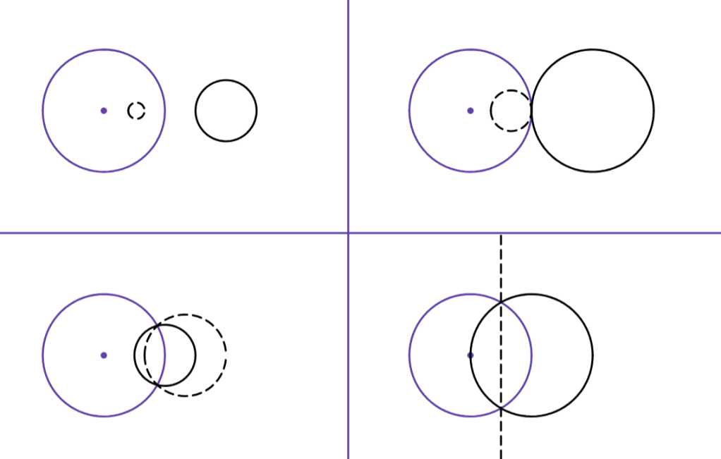 An interesting fact about circular reflection is that circles and lines always reflect to other circles and lines. For this, lines are effectively circles that intersect the “point at infinity”, so lines reflect to circles intersecting the center, as that reflects to the “point at infinity”. (1/0 = ∞?)