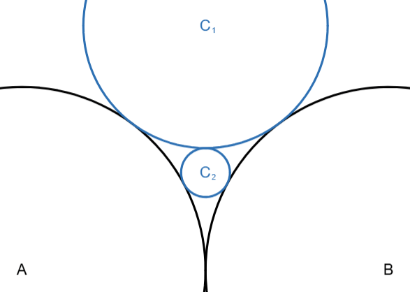 Next, C₂ is the circle that’s externally tangent to A, B, and C₁. This time there is only one.