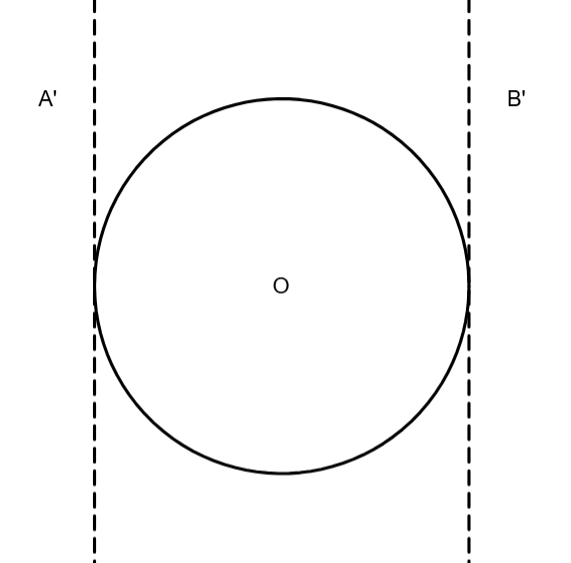 With that in mind, what does A map to? It’s tangent to the circle on the left side, so that stays (points on the circle don’t change), and it touches the center, meaning it’s a line. There’s only really 1 possibility for that, then. And B is the same, just on the other side.